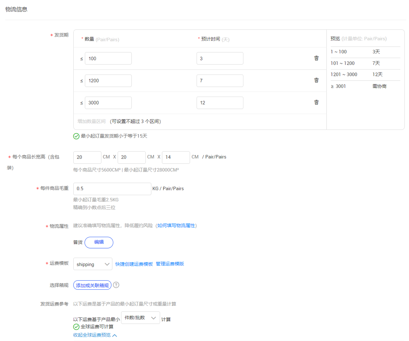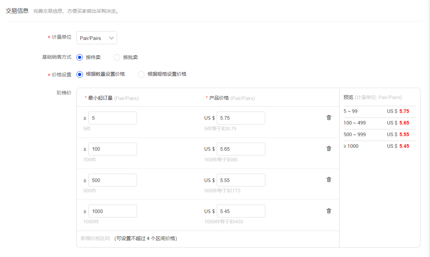 交易信息主要涉及商品售卖的计量单位和售价,需要根据仓库出货能力和企业方的理想利润空间进行计算。最小起订量一般由企业直接提供,学生只需要对商品的利润空间进行计算,针对童鞋,定价方式是商品的成本价除以汇率四舍五入后加五即为单价,针对大批量进行适当优惠即可,且不得低于成本价除汇率后的125%。