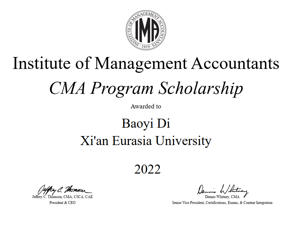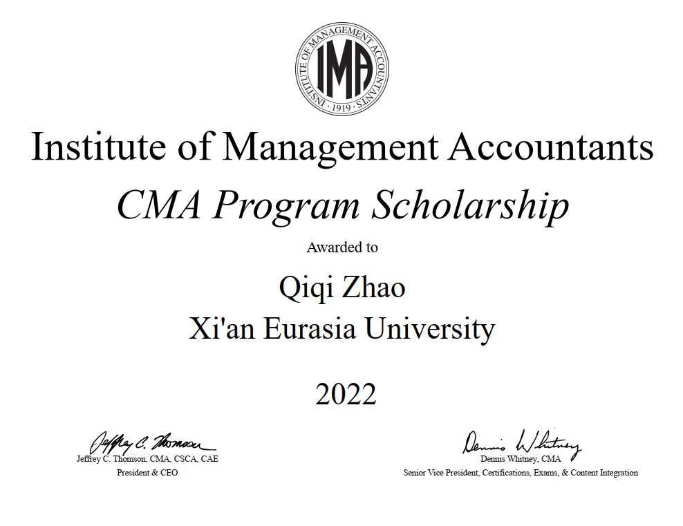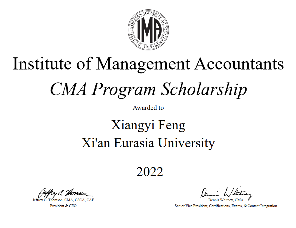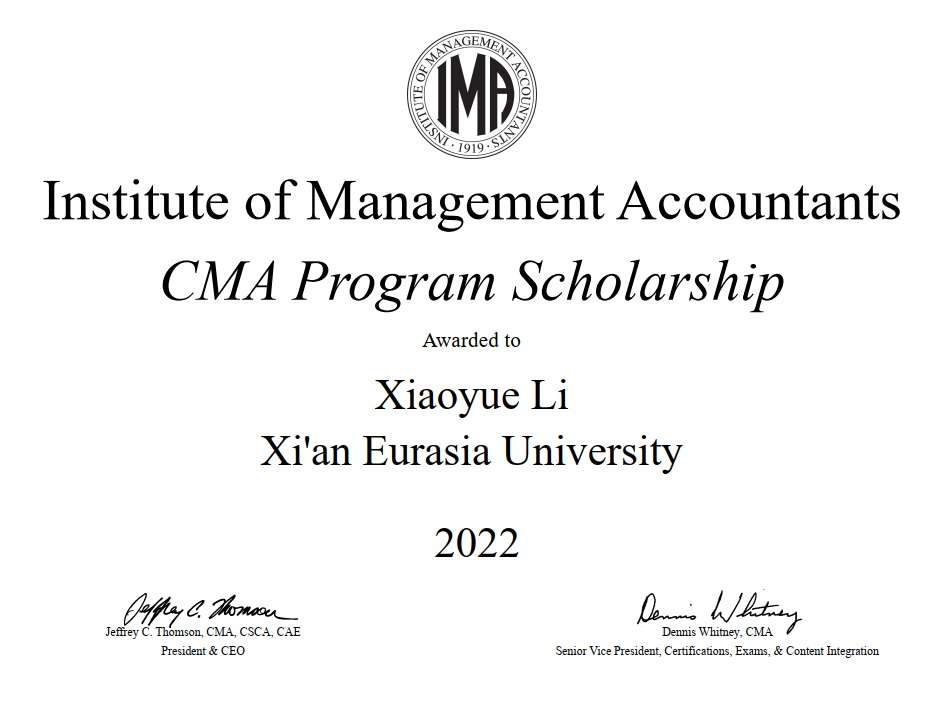 鸭脖会计学院邸宝怡、赵琦琦、李晓月、冯向怡、康梦洁等5位学生经过报名申请、提交复习计划、多维度筛选最终通过IMA协会审核,获得2022年度CMA奖学金。美国注册管理会计师(Certified Management Accountant,简称CMA)奖学金项目由美国管理会计师协会(The Institute of Management Accountants,简称IMA®)自2012年开始推广,为获得提名的优秀学生提供免费注册成为CMA考生及参加CMA考试的机会(等值约6,000人民币)。CMA证书作为享誉世界的国际管理会计通用证书,被全球180个国家认可,有国际财务界的MBA之称,是国际企事业单位财务从业者的必备证书。鸭脖学子荣获IMA协会CMA奖学金,标志着鸭脖财务管理专业关于管理会计人才培养工作及教学质量达到了国际职业人才培养与评价的认可标准。