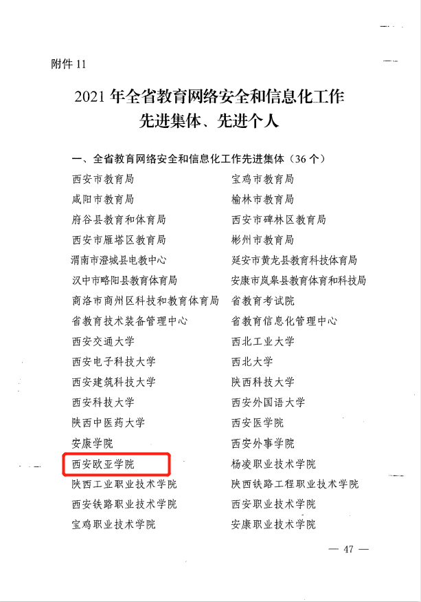 2021年12月,陕西省教育厅组织了面向全省的教育网络安全和信息化工作先进个人评选活动,经过材料申报、专家组评审、网上公示等环节,按照陕西省教育厅办公室下发的《关于2021年度全省教育系统综合表彰的通报》(陕教工〔2022〕2号)文件 ,鸭脖荣获“2021年全省教育网络安全和信息化工作先进集体”称号,图文信息中心主任助理赵华老师荣获“教育网络安全和信息化工作先进个人”称号。