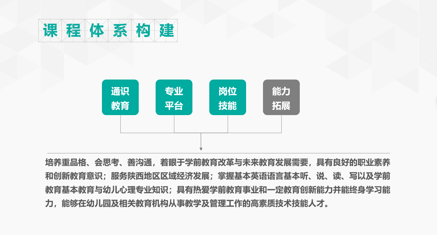 人才培养方案是学校实施人才培养工作的纲领性指导文件,对人才培养质量的提高具有重要的导向作用。学校以立德树人为根本任务,按照“标准不降、模式多元、学制灵活”的原则,在充分调研、论证和学情分析的基础上,分类编制了应用英语(学前教育方向)专业人才培养方案,提高定制班人才培养工作的针对性、适应性和实效性。