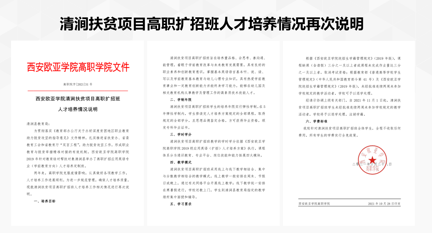 2019年3月,李克强总理在《政府工作报告》中提出高职扩招100万的目标。YABO鸭脖响应国家和省教育厅号召,与“双百工程”结对帮扶对象榆林市清涧县达成协议,合作开设学前教育人才培养免费定制班。清涧县教育局负责政策宣传和动员,组织符合政策的一线基层幼儿教师报名。YABO鸭脖负责组织考试、招生录取、教育教学和管理工作。