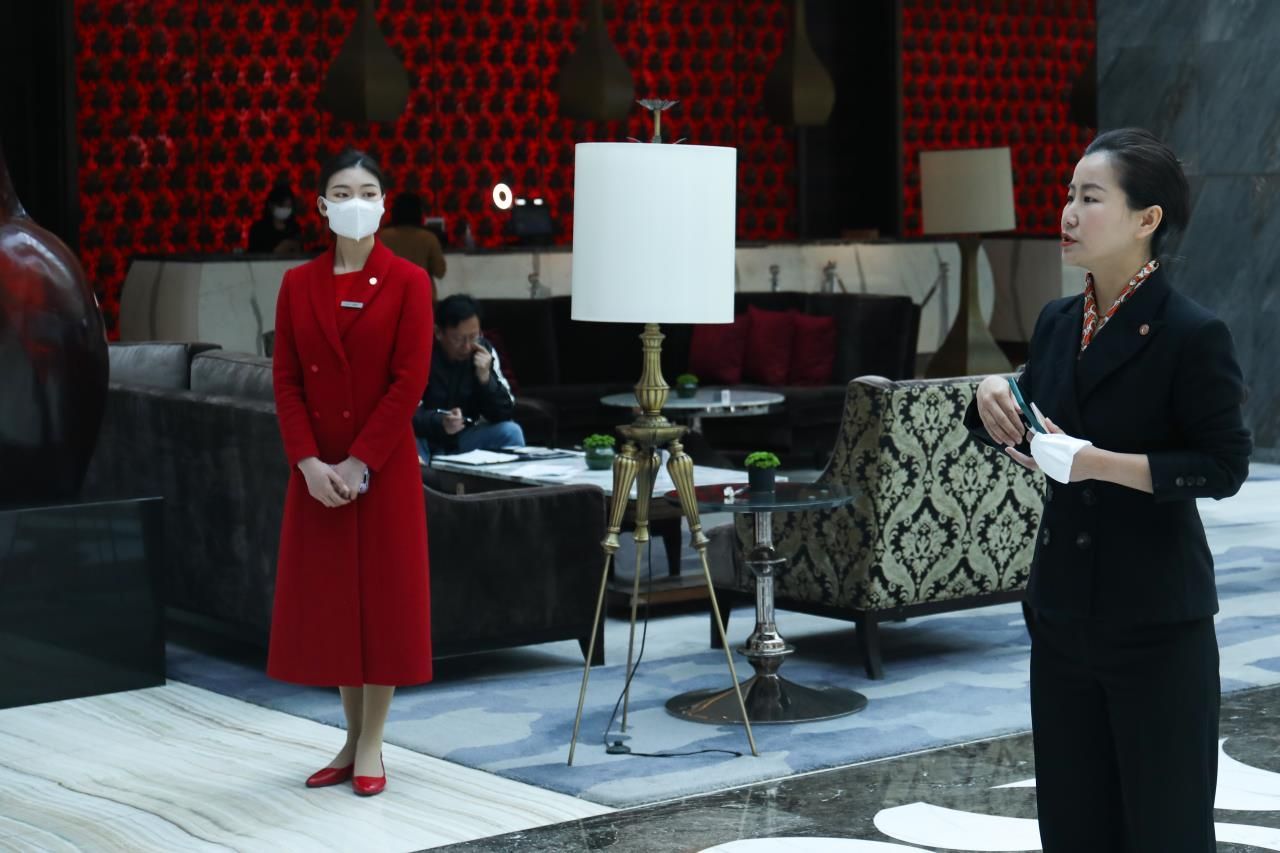 正当被酒店独特的设计风格所吸引时一位穿着红衣服、戴着红手套的小姐姐微笑着向我走来 ——如和煦的春风拂面。走近前台我们进行了很有趣的情景互动:客人与服务人员的角色扮演,小姐姐无微不至的关心让我明白了,想要服务好一个客人,必须注意每个细节。