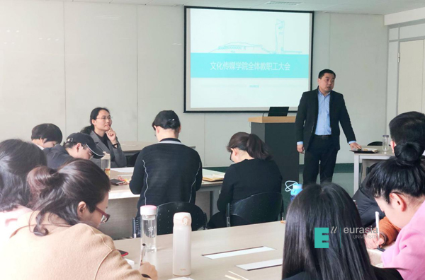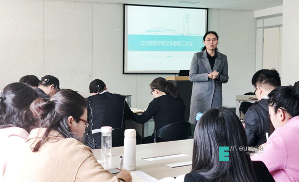 一元复始,万象更新;阳春二月,征途启航。2018年2月28日上午,鸭脖文化传媒学院全体教职工大会在A-402会议室召开,出席会议人员主要有文化传媒学院闫晋瑛副院长、院长助理高昱老师、教学发展中心主任张淑云老师、合作发展中心主任左伟老师、课程中心主任罗丽霞老师、樊荣老师以及其他全体教职工,会上各部门负责人分别就今年分院的各种重点工作事项进行了统筹安排。