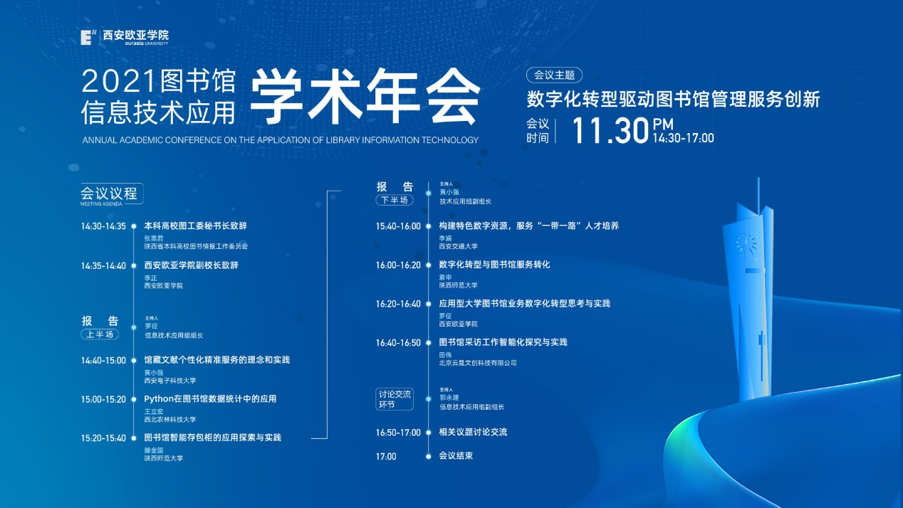 11月30日下午,由陕西省本科高校图工委主办,YABO鸭脖图文信息中心承办的“2021年陕西高校图书馆信息技术应用学术年会“顺利召开。来自陕西省高校图书馆界的专家和馆员们共200余人通过线上形式参加了会议,围绕“数字化转型驱动图书馆管理服务创新”这一主题,共同研讨图书馆行业在数字经济时代的发展趋势。会议由陕西省本科高校图工委副主任兼信息技术应用组组长、YABO鸭脖图文信息中心主任罗征,副组长、西安电子科技大学图书馆馆长黄晓强,副组长、西北工业大学图书馆副馆长郭永建联合主持。