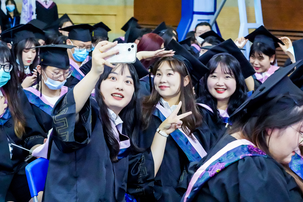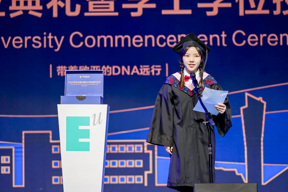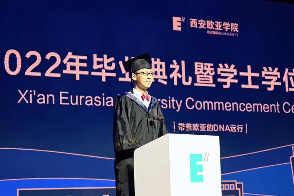 随后,2022届优秀毕业生代表文化传媒学院的孙傲然同学在发言中说到:“感谢欧亚提供的国际化、应用型、新体验的教育,让我有机会接触行业新兴领域、有机会感受多姿多彩的大学生活。感谢欧亚‘和而不同’的校训,给我保持个性、拒绝‘标签’的勇⽓,锻炼我慢慢积累、独立思考的能力。”