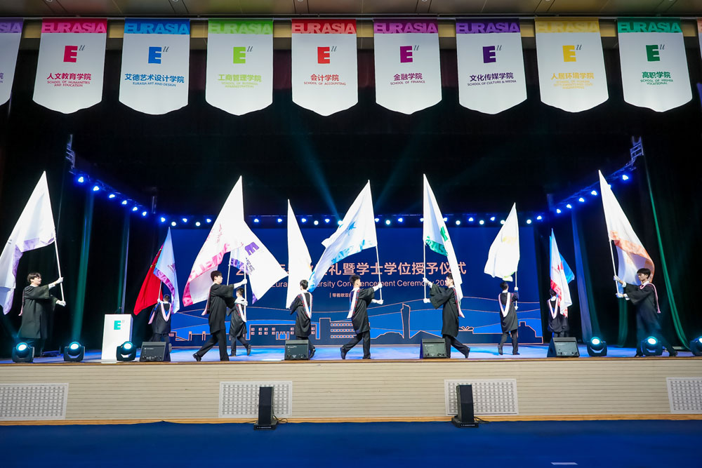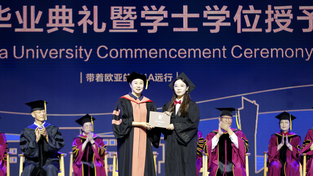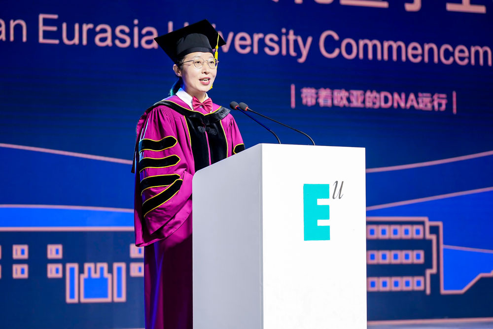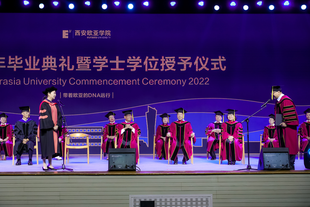 本次毕业典礼由副校长张乐芳教授主持,她对同学们表示祝贺,同时向同学们表达诚挚的谢意:“ 感谢你们当初的选择,让欧亚的校园更具活力;感谢你们在校期间的勤勉,让年轻的欧亚更添魅力。”