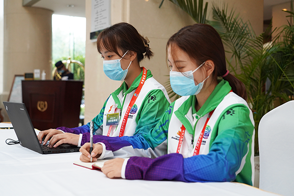 随叫随到,随时待命,哪怕深夜正在休息,一个吩咐下来,他们就得打起十二分精神立马起来工作:整理文档,修改加急文件,印发资料,询问用餐人员数量,记录来访嘉宾和办理入住信息……看似琐碎细微的工作,志愿者们一点也不含糊,努力做到最好。有时候为了提高办事效率,志愿者要连跑带走,嘴里含着早点午餐,手上忙着工作,眼里全是排好队的任务。