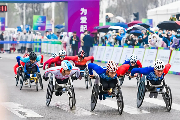 轮椅竞速组选手在马拉松比赛中