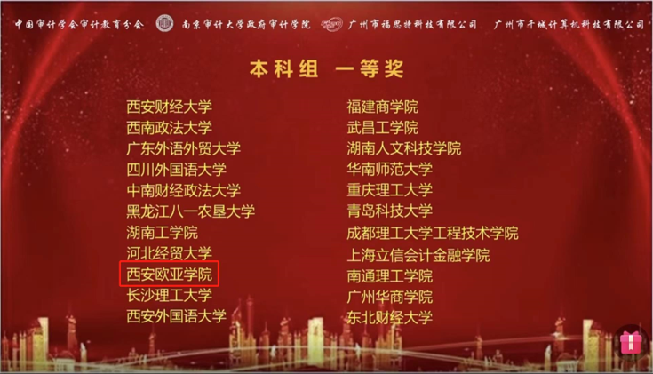 2021年11月14日,由中国审计学会审计教育分会主办,南京审计大学政府审计学院承办,广州福思特科技有限公司、广州市千城计算机科技有限公司提供技术支持的2021年“福思特杯”全国大学生审计精英挑战赛正式拉开帷幕。此次比赛吸引了南京审计大学、东北财经大学、西北工业大学、西南政法大学、上海对外经贸大学、中南财经政法大学、西安财经大学等300多所高校,近千名学生参与。鸭脖会计学院由吴燕妮、贺鸣两位老师带队,审计学专业2019级李婧、姚变变、杨成香三名学生组队,经过两个半小时的激烈角逐,喜夺一等奖。