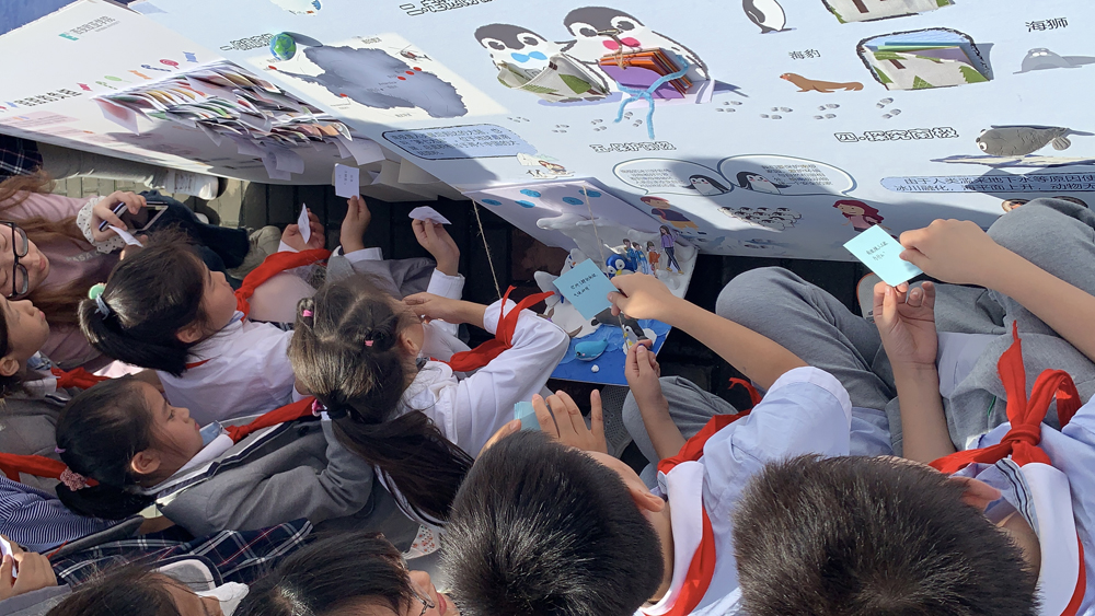 在“冰雪奇缘——南极小分队”的现场,小学教育专业的大学生们让小学生借助地球仪模型去寻找南极的位置,接着利用问题卡片引导小学生阅读南极相关知识,并在教师组织下完成问题卡片上的问题,由小学生随机抽取附有问题的卡片并解答。经过这场别开生面的“南极体验”,孩子们对南极产生了极大的兴趣,提出了许多有趣有意义的问题,更有一位小学生励志长大后去南极探险。