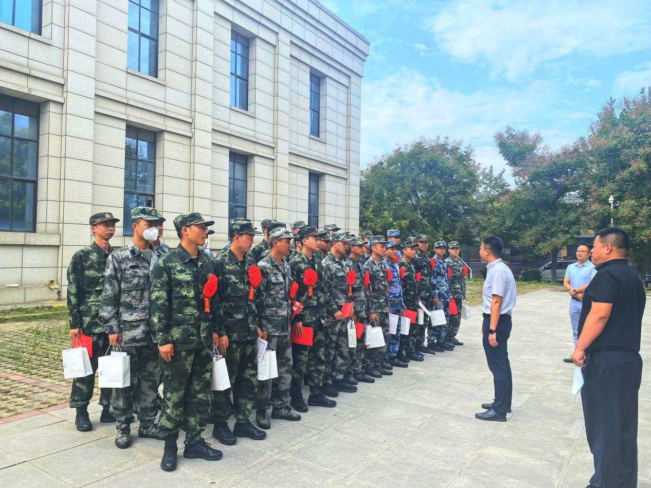 鸭脖学生发展处副处长董杨,保卫处处长高奇,高职社区主管王先昌、专武干部李涛等前往训练基地,前来为即将入伍的32名新兵送行,向他们送去学校的关怀和问候,并对大家顺利完成役前训练,启程奔赴军营表示祝贺。