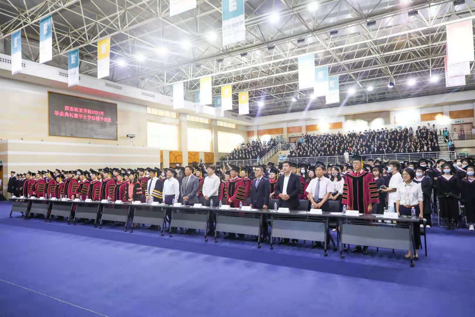 典礼正式开始前,硕大的校旗从毕业生们的头顶飘过,全体观众共同见证毕业生们再一次与欧亚拥抱。在大家的掌声、欢呼声中,国旗、校旗、分院旗相继入场,雄浑豪壮的中华人民共和国国歌为毕业典礼拉开了序幕。