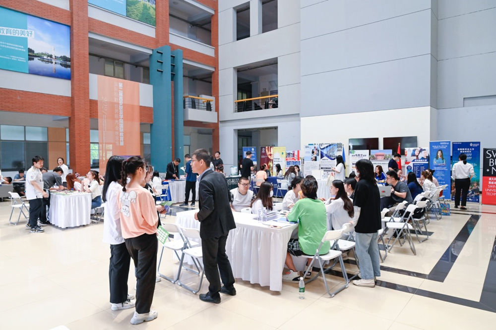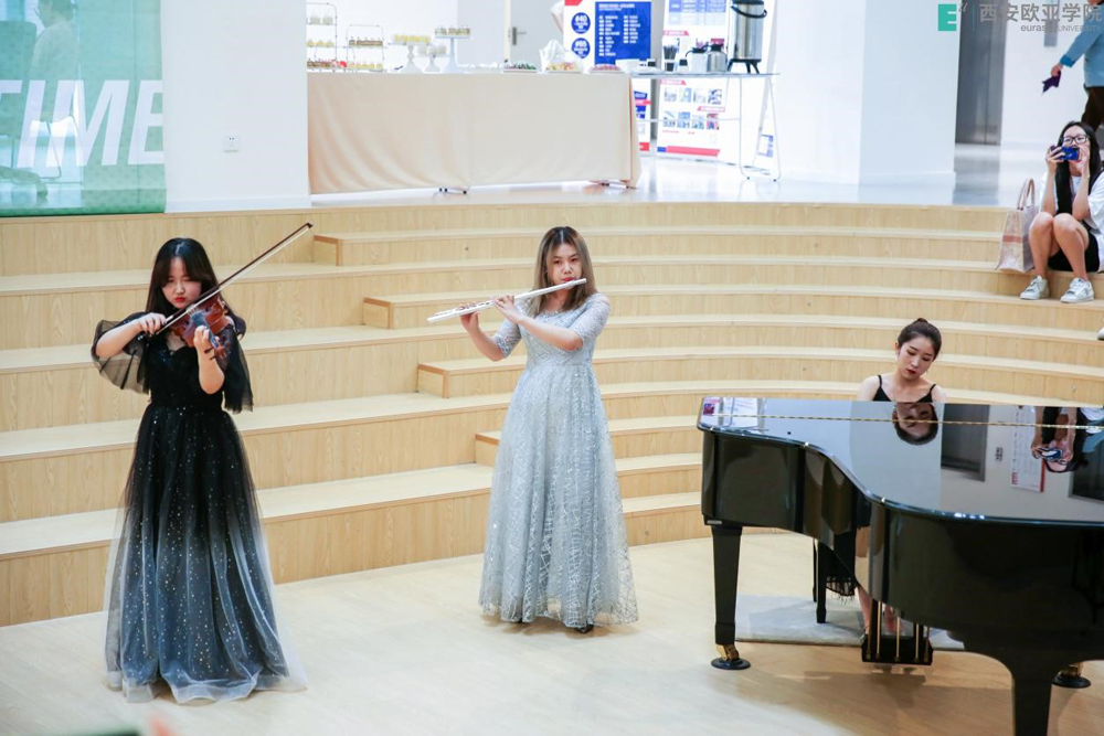 本次国际教育展分为两场主题活动:5月19日的教育展开幕式和5月20日的国际教育交流咨询会。国际班优秀学生代表陈涛和刘妍鹭作为本次教育展开幕式的中英双语主持人,精彩开场。随后鸭脖人文教育学院的学生通过钢琴、小提琴、长笛的美妙合奏为在场的领导、嘉宾及分院师生演奏了著名曲目RIVER FLOWS IN YOU及SUMMER。舒扬的音符在北E大厅婉婉飘散,让每一位听众容颜舒展,心生惬意。
