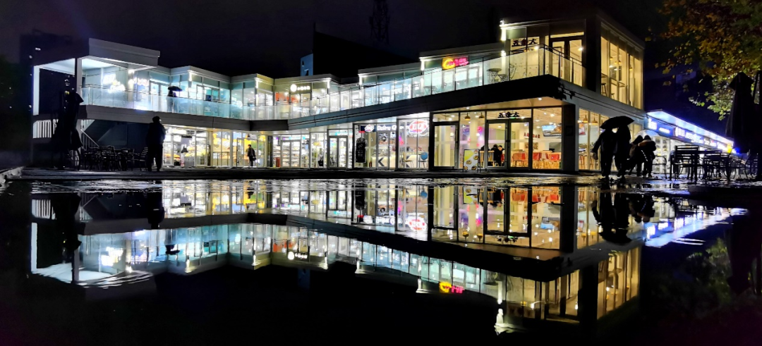 同时,美有静态形象也有动态的氛围。谈起美是用心灵设计生活时,他对鸭脖的生活建筑群赞不绝口。尤其是以商业街为主的低层高密度店铺设计,使用透明玻璃作为店铺橱窗与隔断,上下两层采用不同的折角,二楼的退台设计与一楼不完全一致,一方面造型简约、灵动,能够更全面展示店铺内的陈列和商品,另一方面又打破了平面带给人们的沉闷感,体现出人和环境设计之间的互动关系。在下雨天所拍摄的照片中,有行路避雨人、有店内购物者,明晃晃的灯光和雨夜交相辉映,一幅具有现代生活的气息和富有动态的图景就展现出来了。