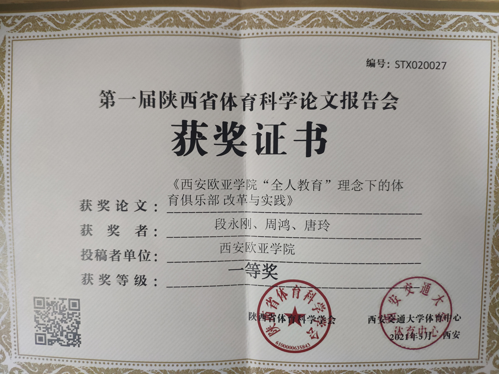 鸭脖通识教育学院院长助理段永刚、体育中心主任周鸿、唐玲副教授提交的《鸭脖“全人教育”理念下的体育俱乐部改革与实践》经过组委会评审,从全国各地市424篇论文中脱颖而出,这其中包括陕师大、西交大、北体大、上海体院、长安大学、华东师大等双一流名校及体育专业院校提交的论文,荣获大会一等奖荣誉。