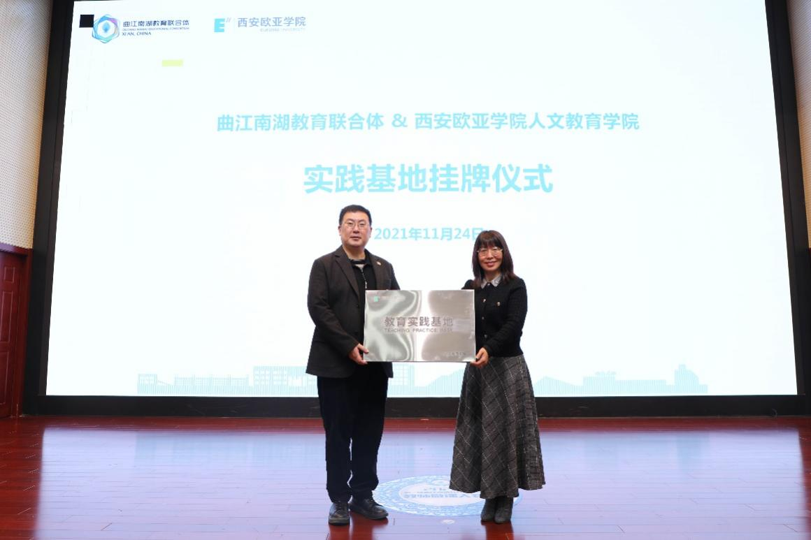 座谈会之后,曲江南湖教育联合体-人文教育学院“教育实践基地”挂牌仪式举行,这是双方继2018年12月签署《教育实践合作框架协议》后,正式揭牌实践基地。张乐芳副校长与穆怀宇校长代表合作双方进行授牌,并合影留念。