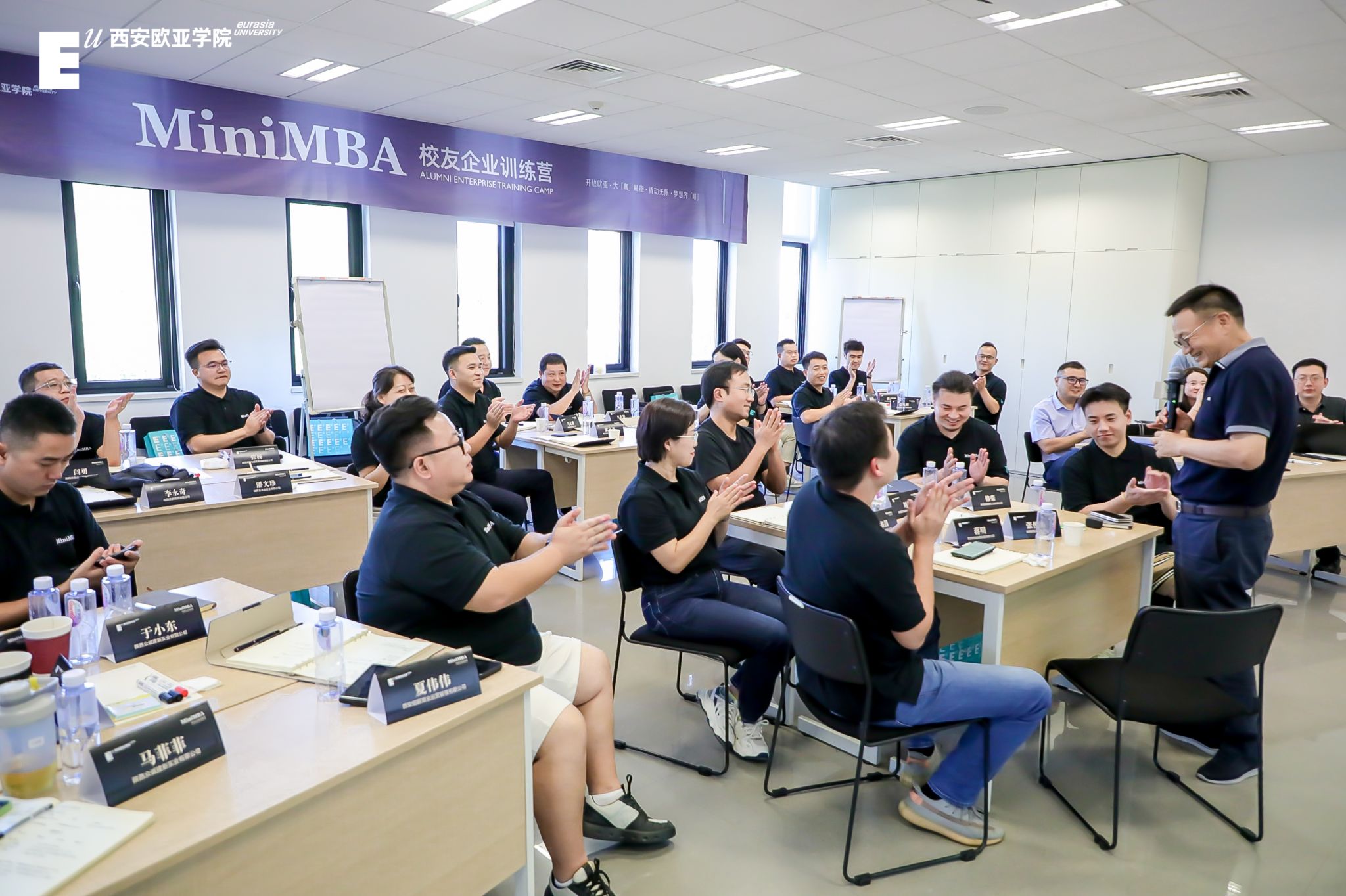 课程结束后,胡建波与学员们围坐一起,就“你所在企业的事业理论三个假设”为题展开讨论。他进一步明确了学校将始终坚持开放办学,倡导终身学习、保持知识更新的理念。学校也将继续为社会培养更多菁英管理人才,为14万余名欧亚校友的成长与发展提供更多实际的帮助。