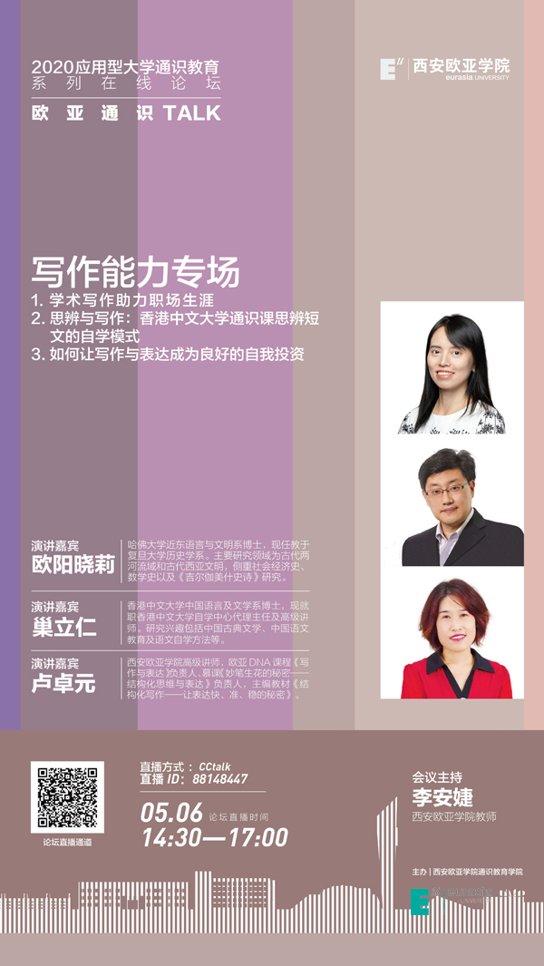 “欧亚通识TALK”第二场写作能力专场,将于5月6日正式上线。写作能力专场邀请到三位具有丰富高校师生写作研究经验的专家学者,以学术、思辨与表达等写作要素为切入点,展开主题研讨。