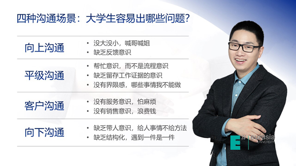 按照业务划分,职场沟通包含向上沟通、平级沟通、客户沟通、向下沟通四种场景:向上沟通应该保持尊敬,接收任务要有反馈意识;平级沟通要有流程意识,明确任务界限;与客户沟通时应有服务意识和销售意识,善于从沟通中发现商机;与下级沟通时注意结构化意识,不仅要安排任务也要教授方法。