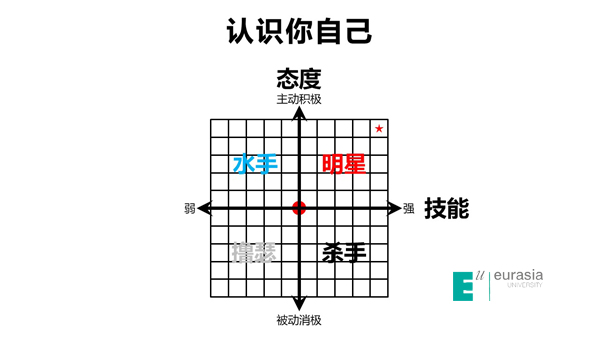 职场新人常常误以为知识或技能是三法器中最为重要的,殊不知在老板心中职场新人的态度才是位居第一的。对待工作的态度,可以表现为主动积极或被动消极。态度结合自身技能,就可以把职场新人分为四类:明星、水手、Loser、杀手。其中“明星”的技能强大,态度主动积极,是最受老板喜欢的一类。