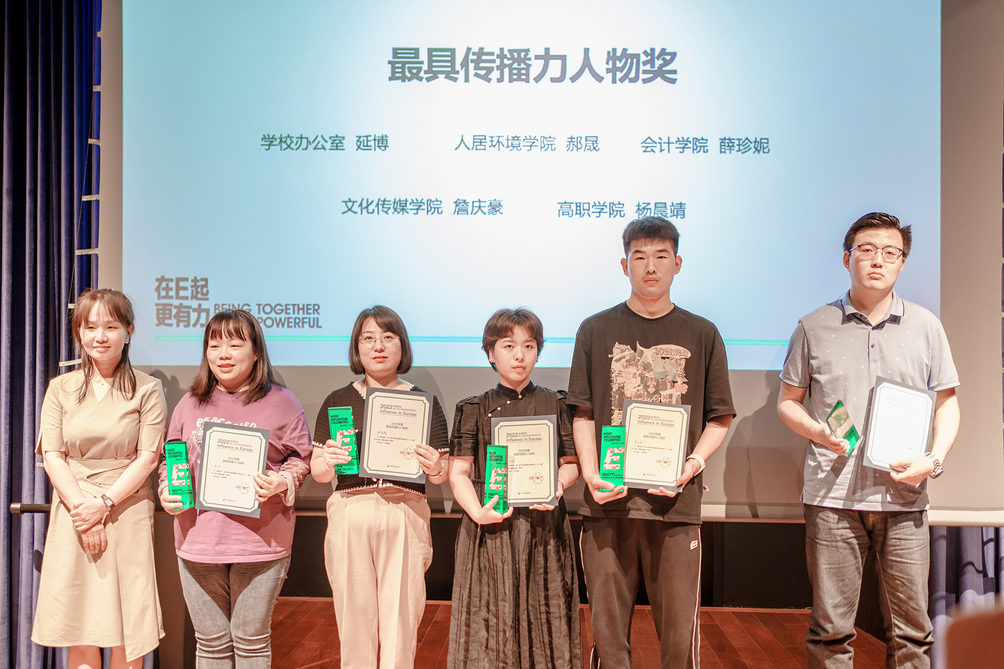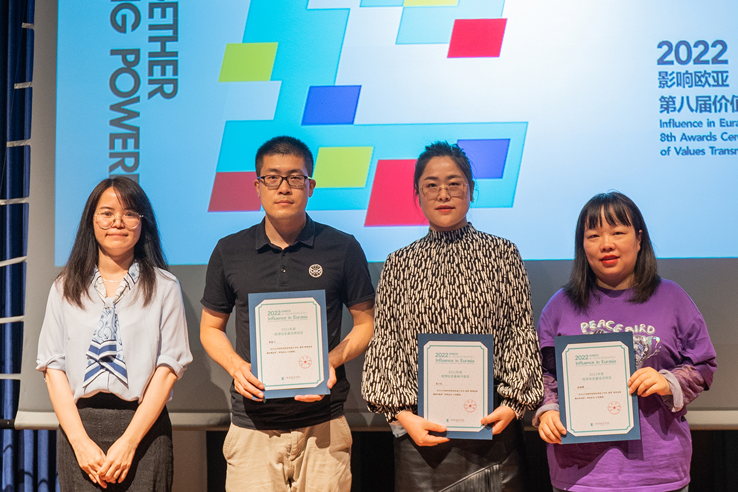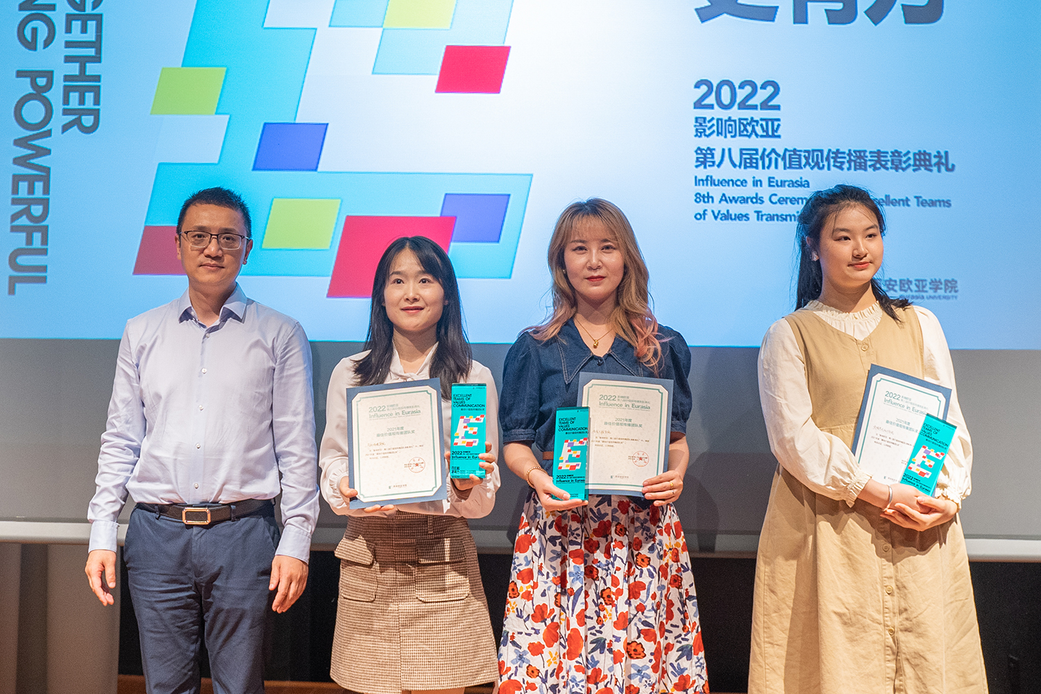 表彰典礼上,校内11支团队、15位个人、17件作品以及3家社会媒体分别摘获最佳价值观传播团队、最具传播力人物奖、最佳品牌活动奖、政务信息最佳协同奖等11大奖项。今年,政务信息表彰首次纳入到价值观传播表彰典礼中,旨在让更多从事政务信息报送与提供政策咨询建议的老师加入到大协同的传播团队,扩大欧亚热点信息与活动在校内外多渠道的发声和曝光。