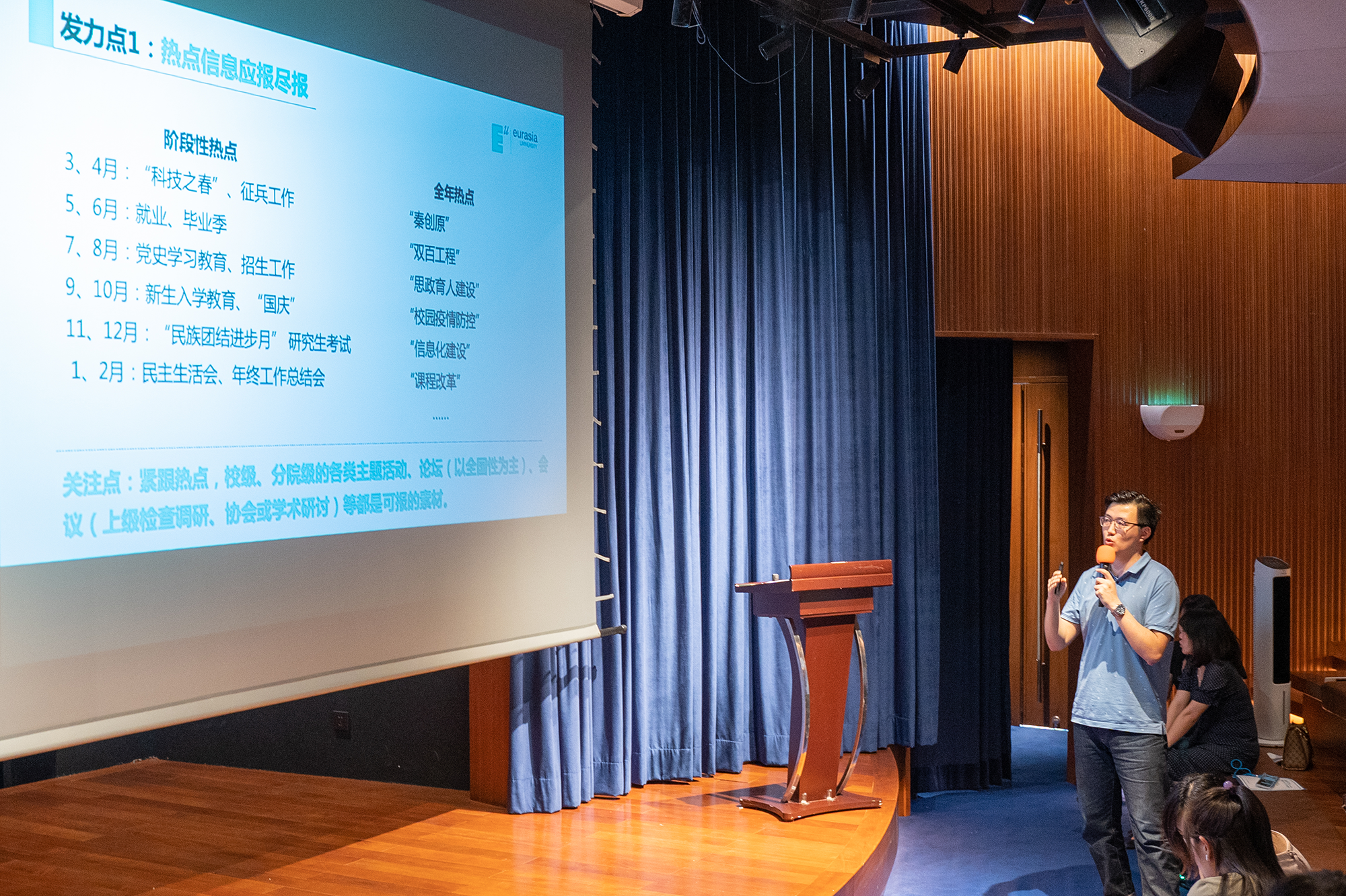 最后,学校办公室延博老师带来了《政务信息报送的“金线”》主题分享,就如何做好疫情常态化背景下的品牌宣传,如何更深入挖掘政务信息资源,准确反映工作情况,不断提高信息采用率,向传播专员作了说明。