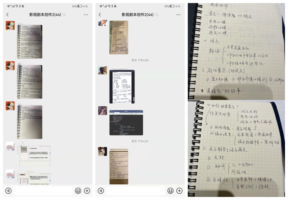 互动2:《影视剧本创作Ⅱ》将理论基础和准备工作放在线上教学,很考验学生学习掌握程度和实践操作准备进度。教师通过课上督促学生完成笔记并上传微信群,监督学生学习,课下定时将准备进度在微信群反馈,可以及时观测学生实操准备情况。
