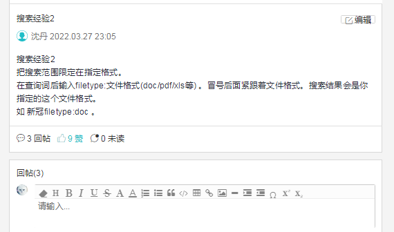 设计2:通过多种案例讲解,让学生熟悉相关信息资源,掌握高效检索与获取、准确评价与管理信息的基本技能,并且使学生初步具备利用恰当的信息思维,适时创造新信息的能力。在重难点知识讲解后,通过鼓励学生发布讨论贴等方式落实朋辈教学法。