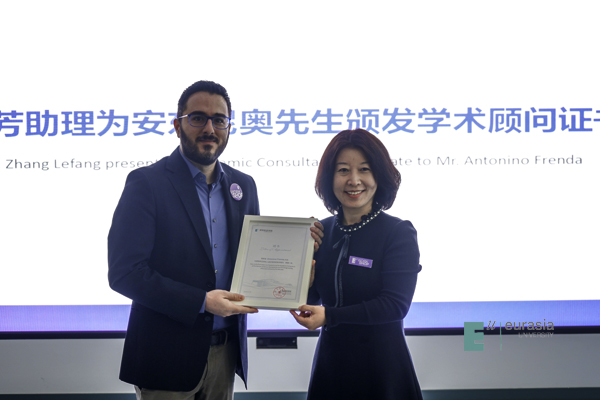 鸭脖校长助理张乐芳对各位嘉宾的到来表示欢迎。Links基金会&欧亚新工科合作启动仪式,张乐芳助理为Antonino教授颁发了学术顾问的荣誉聘书。张乐芳介绍,Links Foundation是享誉全球的基金研究机构,是意大利政府资助的为都灵理工大学输送高素质人才的综合性组织;以提供多元的技术(包含软件开发、建筑规划、教学、咨询等)和商业模式加速企业与政府的创新过程为目标。欧亚学院致力于为学生提供高质量的教育服务,倡导国际化、应用型、新体验的教育理念,我想双方未来在人才培养、教育咨询、创新项目、实习就业等方面会有非常广阔的合作前景,期待双方的合作。