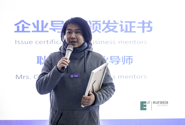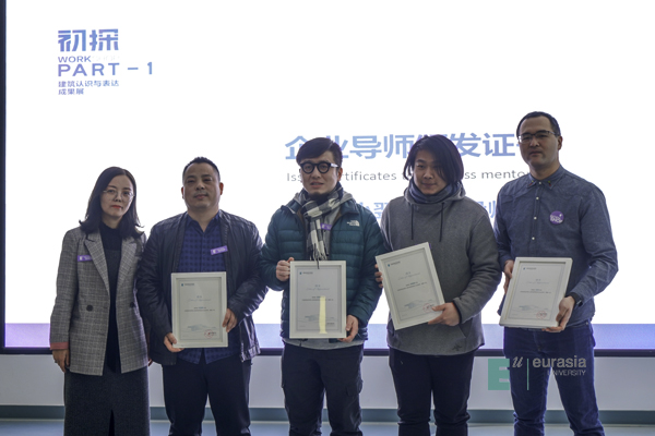 人居环境学院院长助理耿小翌为工作坊企业导师代表吴振亮、杜喜锋、徐毅楠、张笑颁发聘书,并表示感谢。耿小翌助理表示,在人居,老师与学生都很棒。很感动,欧亚有这么好的条件,并不像以前传统的死板学习,希望同学们可以更快乐的学习并享受校园生活。感谢人居学院为同学们提供这么好的学习机会,相信人居学院、欧亚学院一定会越来越好。