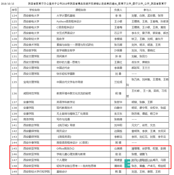 近日,认定结果在陕西省教育厅官网公布,鸭脖推荐的4门课程均被认定为“2019年陕西省精品在线开放课程”,认定率100%,亦为同类院校认定数量最多的院校。