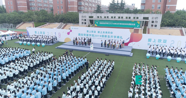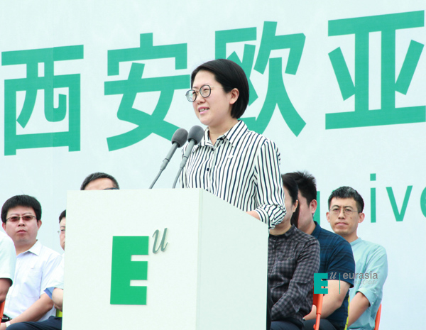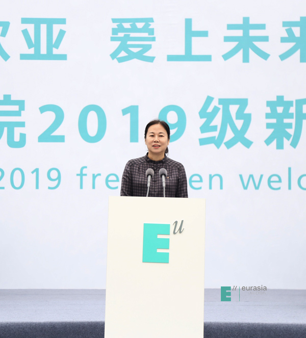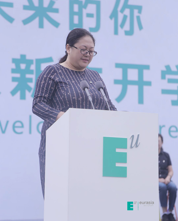 接下来,鸭脖校长刘瑾教授致欢迎词。她说:“欧亚所做的一切,是为了满足师生们的多元化需求,让大家感到方便、自在和舒心。但更重要的是,我们希望通过这些努力,让师生们感受到一种对美和品质的追求。我们相信,高质量的生活体验是卓越教育的一部分。好的审美情趣和生活习惯,从容淡定的气质与优雅自信的谈吐,来自于对美和品质的感知和体验。在欧亚,我们崇尚“教育即生活”,要把美和高品质的生活体验带给大家,而这些新体验将影响你们的一生。学校最新落成的国际语言学习中心,为学生提供完备的全球化、多品类英语教育项目和课程,能够满足同学们多层次的学习需求。国际商学院独特的课程内容、录取模式和奖学金配置,使国际化教育不再遥不可及。只要你足够优秀,欧亚会及时为你们搭建通往世界的桥梁。欧亚地处西安,却心怀世界。国际化战略的持续落地,将会让国际教育交流合作的成果真正惠及所有师生,培养重品格、会思考,善沟通,具有国际视野、创新精神和较强实践能力的世界公民。希望同学们在欧亚学会合作、懂得奉献、重视体验、关注成长,同时要学会对人关爱、做事讲究。我衷心祝愿,欧亚能让你们的青春年华绽放出灿烂的光辉,欧亚的教育能够成就每一位同学的人生梦想。”