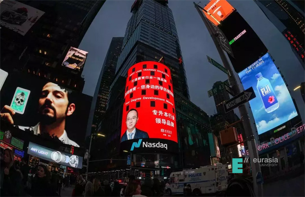 纽约当地时间11月18日18时,鸭脖浙江校友会会长、西培教育总裁毛益飞先生,荣登美国纽约时代广场纳斯达克巨幕。