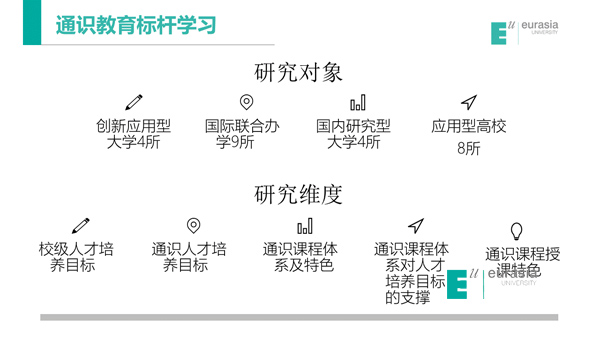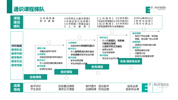 通识教育学院一直致力于应用型大学通识教育研究及课程建设。以欧亚学院的人才培养目标——培养重品格、会思考、善沟通,具有国际视野、创新精神和较强的实践能力的高素质应用型人才的校级培养目标为基准,从注重学科广度,到关注知识结构和思维习惯的能力培养,通识学院课程体系改革的每个阶段都是抓铁有痕、踏石留印:通过大量的企业调研和大数据分析,归纳总结企业对人才“软实力”的关注点,以此为起点从知识、能力、素质三个维度构建通识人才培养体系模型。