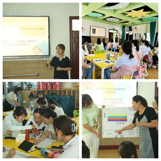 吕梦瑶老师以“教师可以在幼儿园的不同区域、不同空间中设置哪些利于幼儿学习数学的环境?”为核心问题,引导将前三场培训收获的知识与经验进行有效整合,通过分组将自己选择区域或环境融入数学的环境创设,并依次讲解设计意图和内容,尝试将幼儿生活中的数学创设灵活运用在幼儿园各处的环境之中,向幼儿提供更充分的数学学习机会。
