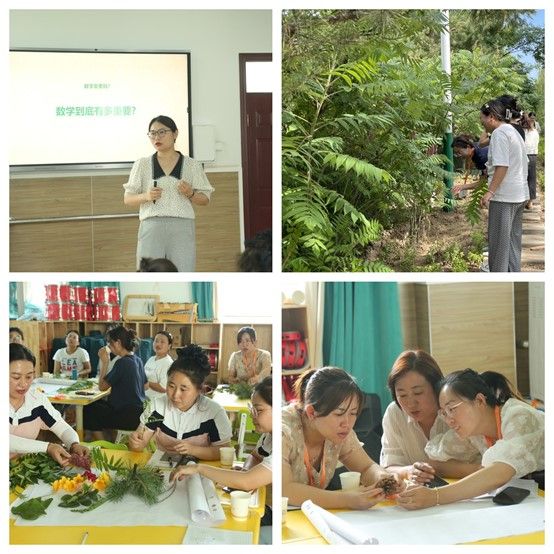 吴涛老师引领老师们走到户外,通过采摘花草植物,用敏锐的数学眼光探索、感受、感知、发现自然界中的美,回到活动室后,老师们互相讨论,设计蕴含数学元素的自然海报,将自然美与数学相结合,并借助花草用数学语言表达美,在一系列自然游戏中锻炼数学思维。