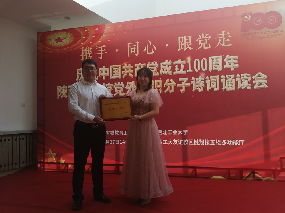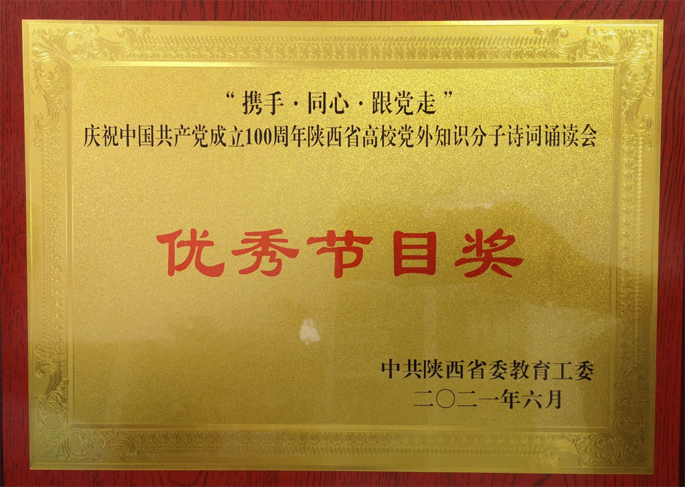 《没有共产党就没有新中国》诗词朗诵得到中共陕西省委教育工委认可、其他学校的好评,同时也被评为“携手• 同心•跟党走” 庆祝中国共产党成立100周年陕西省高校党外知识分子诗词诵读会优秀节目奖。