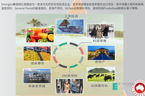 澳洲VSG集团中国北方地区教育主管罗瑶简要介绍VSG集团并展示了该集团的诸多业务与商业理念。VSG集团是澳大利亚最大的肉类出口商和罐头生产商、澳洲第二大的钢铁生产商。集团涉猎许多行业,包括:地产投资、VSG学院、上市投资、吞拿鱼养殖、温室番茄、时装零售、尖端畜牧业和鲜榨水果等八大产业,连续7年蝉联澳洲最具有权威的BRW家族财富排行榜上首富榜榜首。