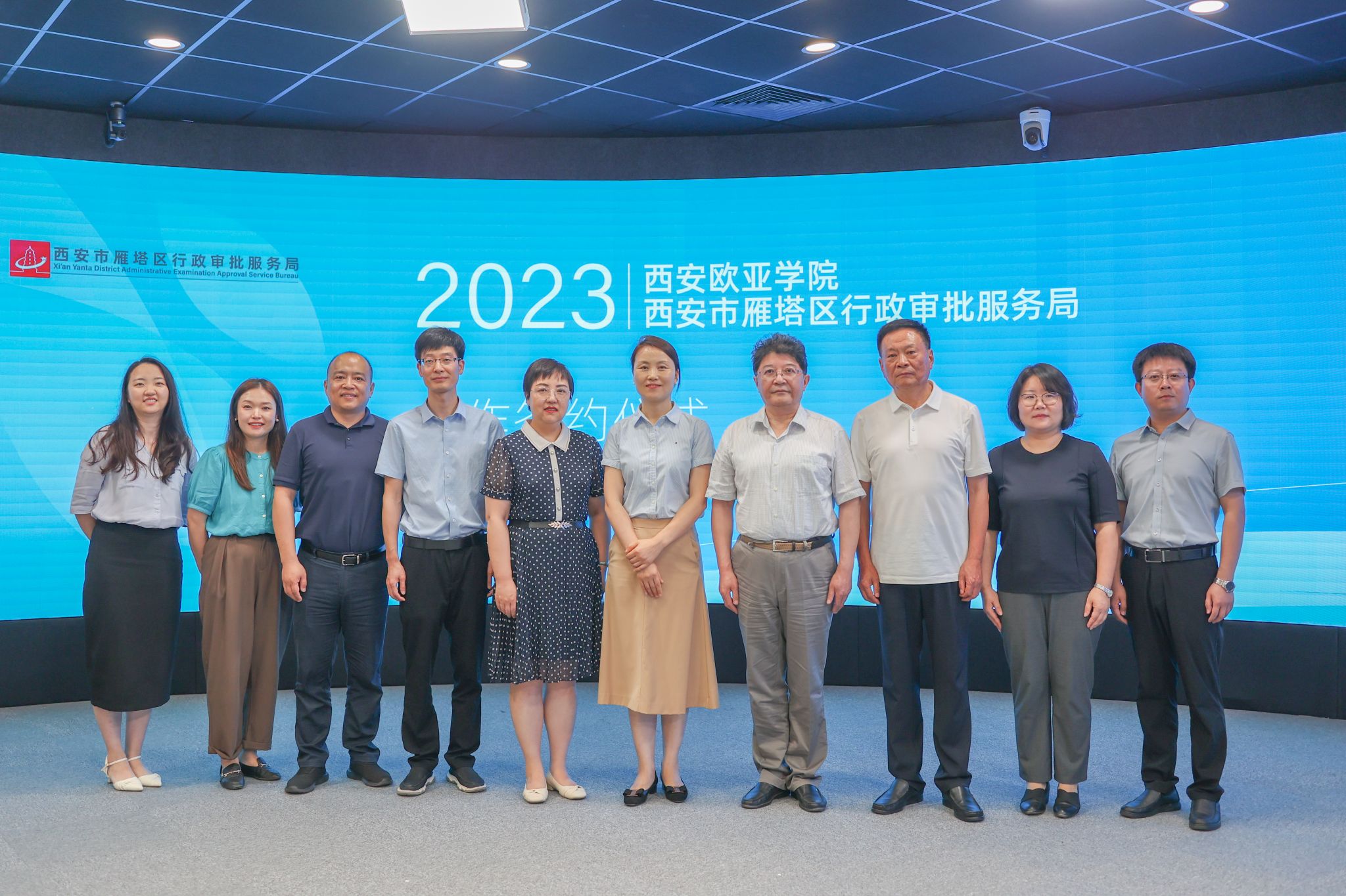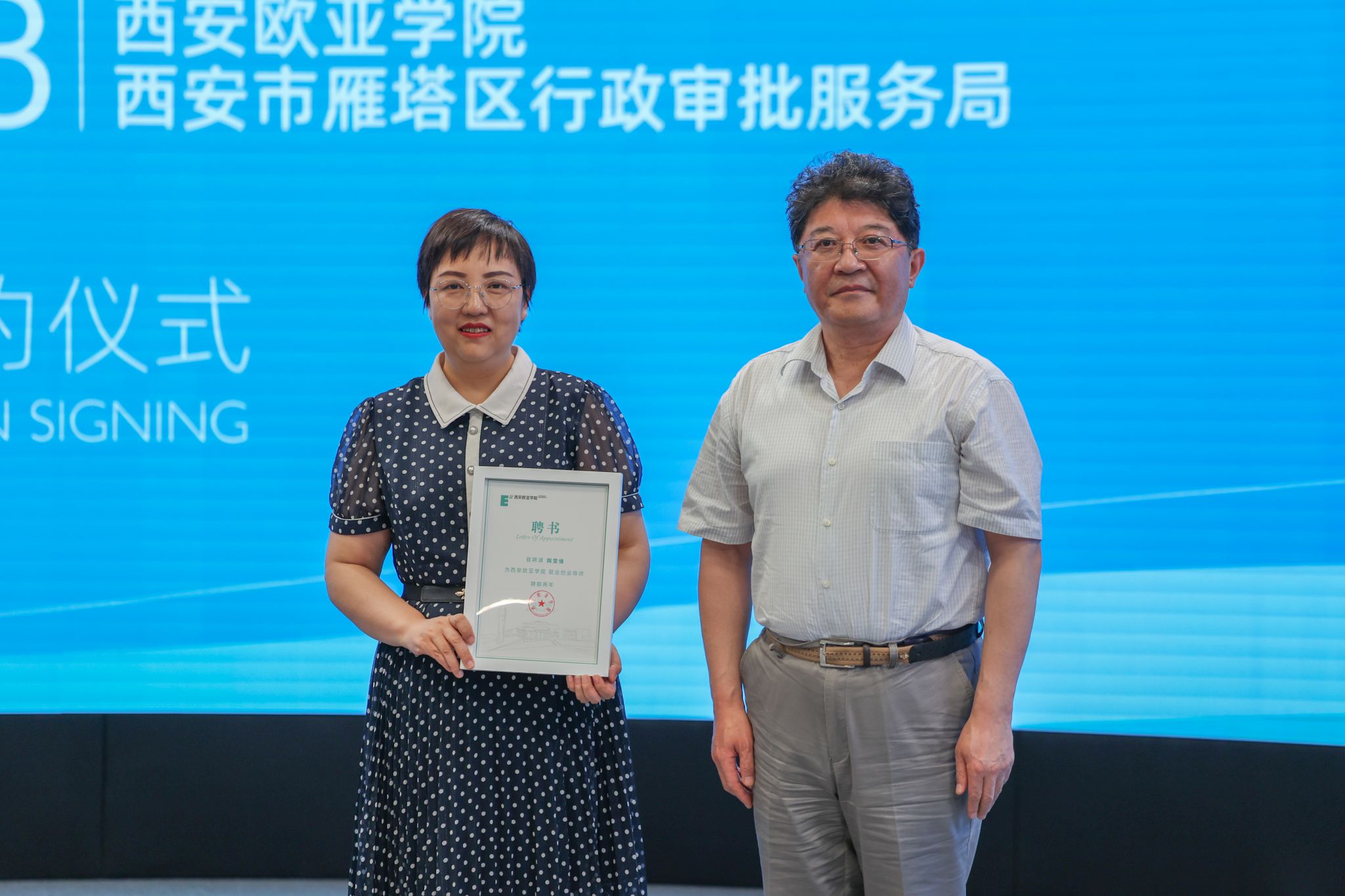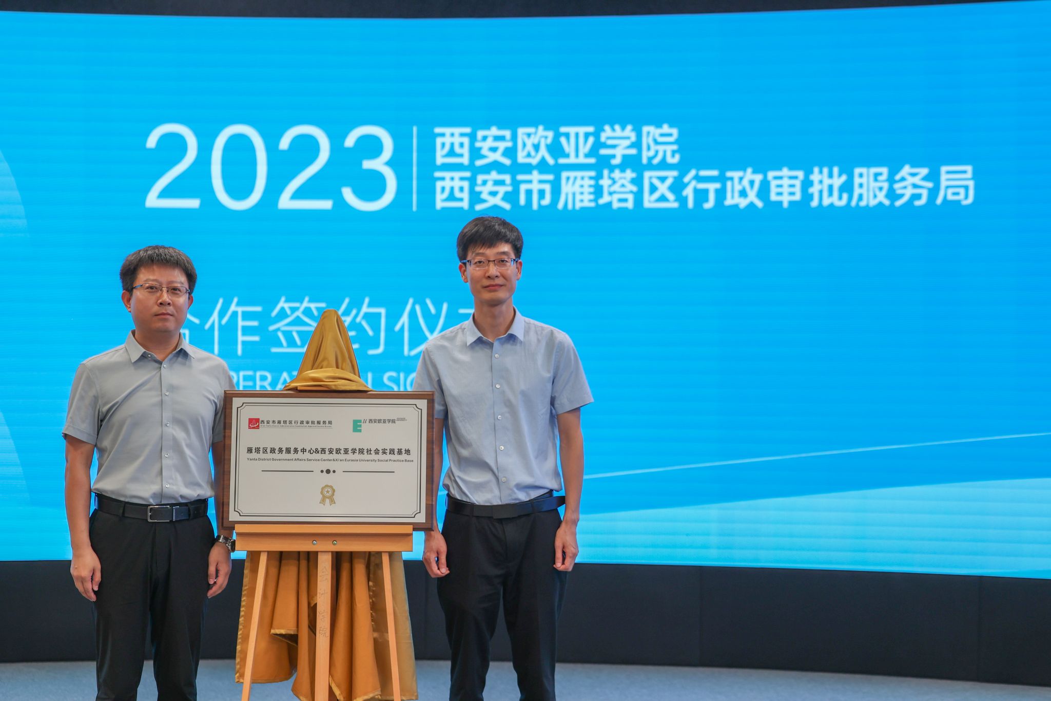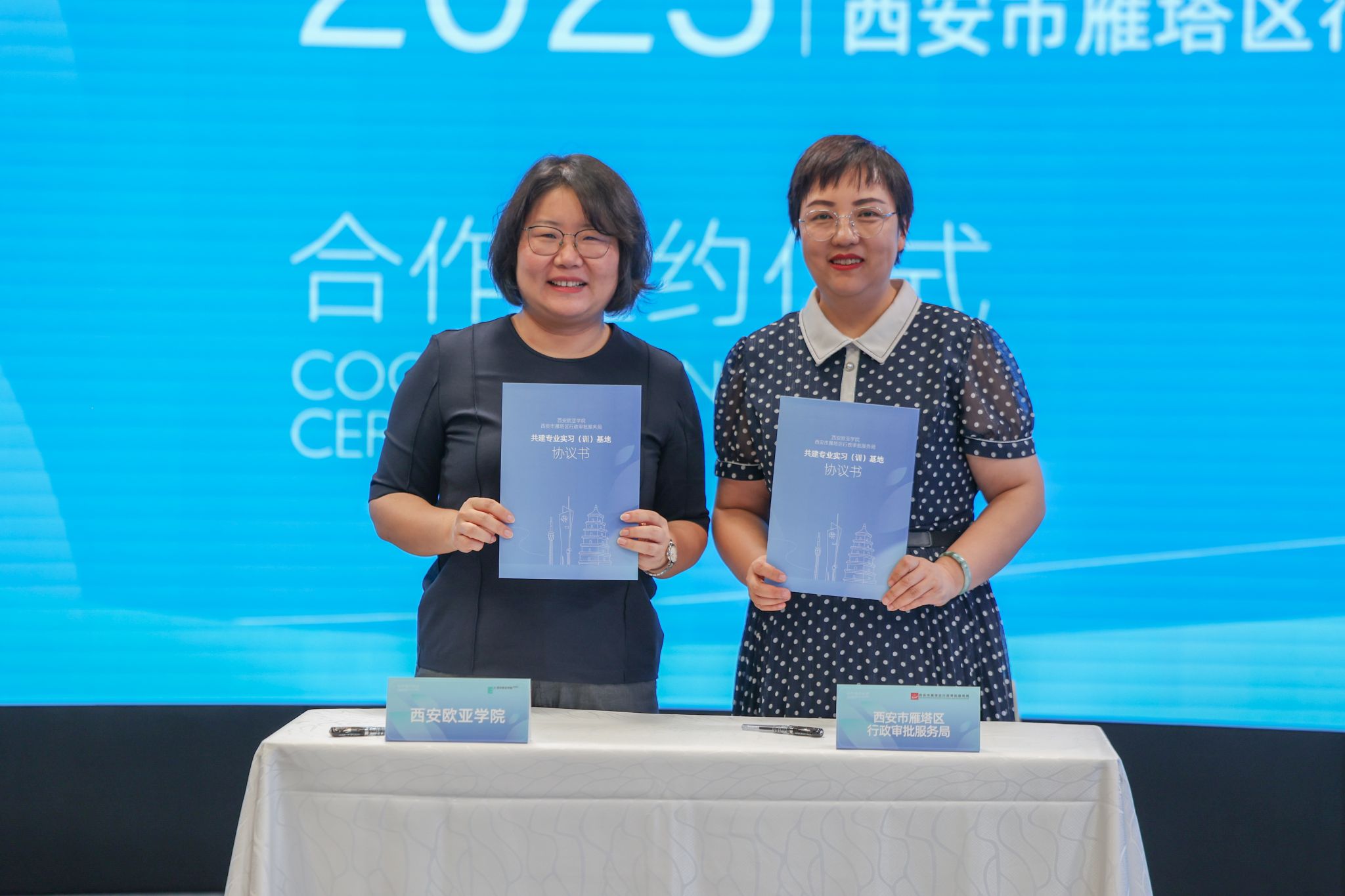 陶雯倩与王艳代表双方签订了《西安市雁塔区行政审批服务局与YABO鸭脖实习基地协议》;郭航与谢涛为“雁塔区政务服务中心·YABO鸭脖社会实践基地”揭牌;学校党委书记于孟晨分别为陶雯倩、郭航颁发学校“就业创业导师”聘书。