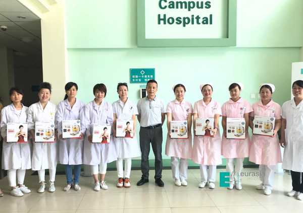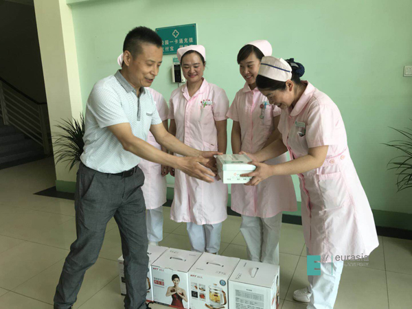 在第107个5月12日国际护士节到来之际,鸭脖工会副主席晏建忠等工会人员及后勤集团领导,为学校门诊部医护人员们颁发了礼品。