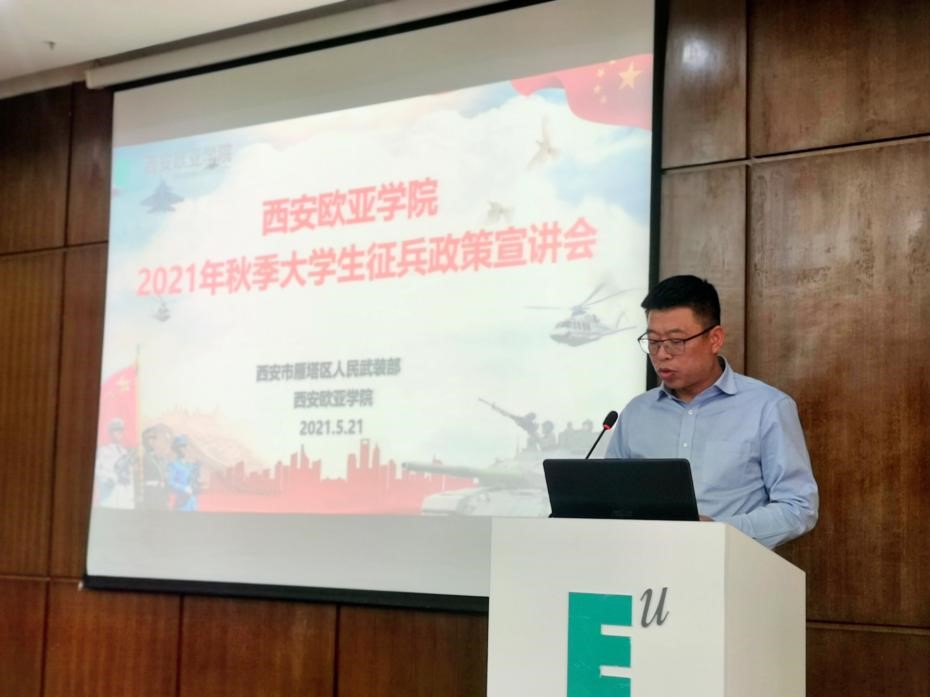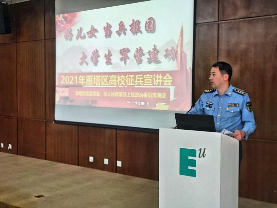 随后发表讲话的是西安市雁塔区人民武装部政委常海波,他从国防和军队调整改革的有关情况以及同学们在军旅生活中的舍与得两方面进行讲解,并为在座的同学讲述了报名参军的基本条件、2021年雁塔区参军入伍优待政策,也同时进行了各类热点问题的解答。