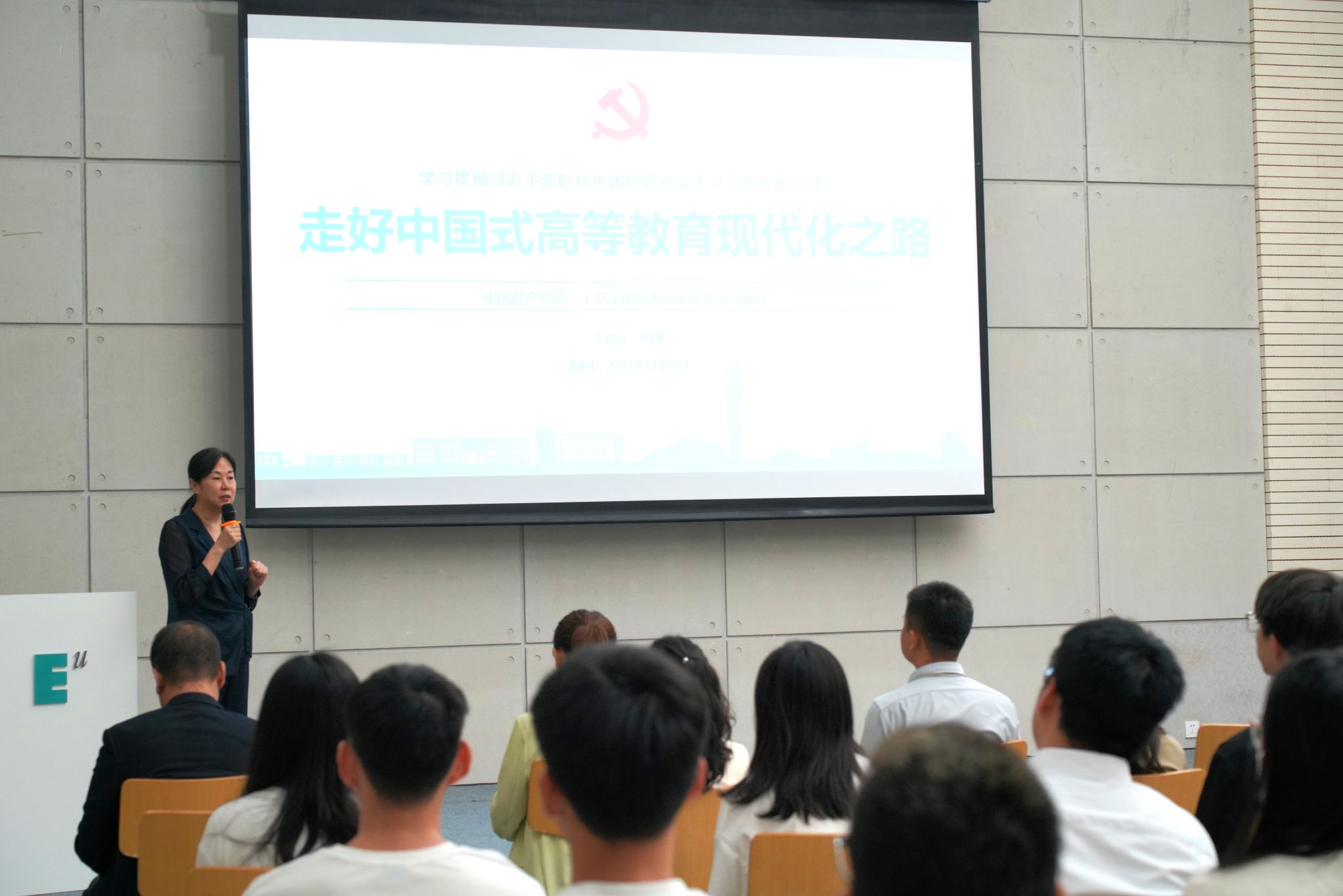 5月24日上午,鸭脖党委副书记、校长刘瑾同志代表学校深入开展学习贯彻习近平新时代中国特色社会主义思想主题教育专题宣讲团,在大学生活动中心多功能厅为师生们带来了一堂生动的主题教育专题党课。本次党课的主题为“走好中国式高等教育现代化之路”,第四青年社区分党委的全体师生党员和入党积极分子共82人现场聆听了这场专题党课。