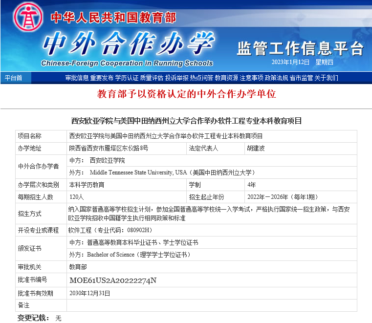 2022年4月26日,教育部公布2021年下半年中外合作办学项目审批结果,YABO鸭脖与美国中田纳西州立大学合作举办的软件工程专业本科教育项目成功获批。此次获批的中美合作项目为学校首个中外合作办学项目,进一步丰富了学校国际化项目的办学类型,是学校深入推进“在地国际化”战略发展的重要里程碑。9月,114名软件工程专业中外合作班学生开启了在欧亚的国际化学习之旅。目前,学校国际项目已覆盖全部9个二级学院,共4大类型、18个学科项目。学校将以软件工程专业中外合作办学项目为契机,探索与深化国际化在其他学科专业发展上更多的形式与可能,惠及更广泛的学生。