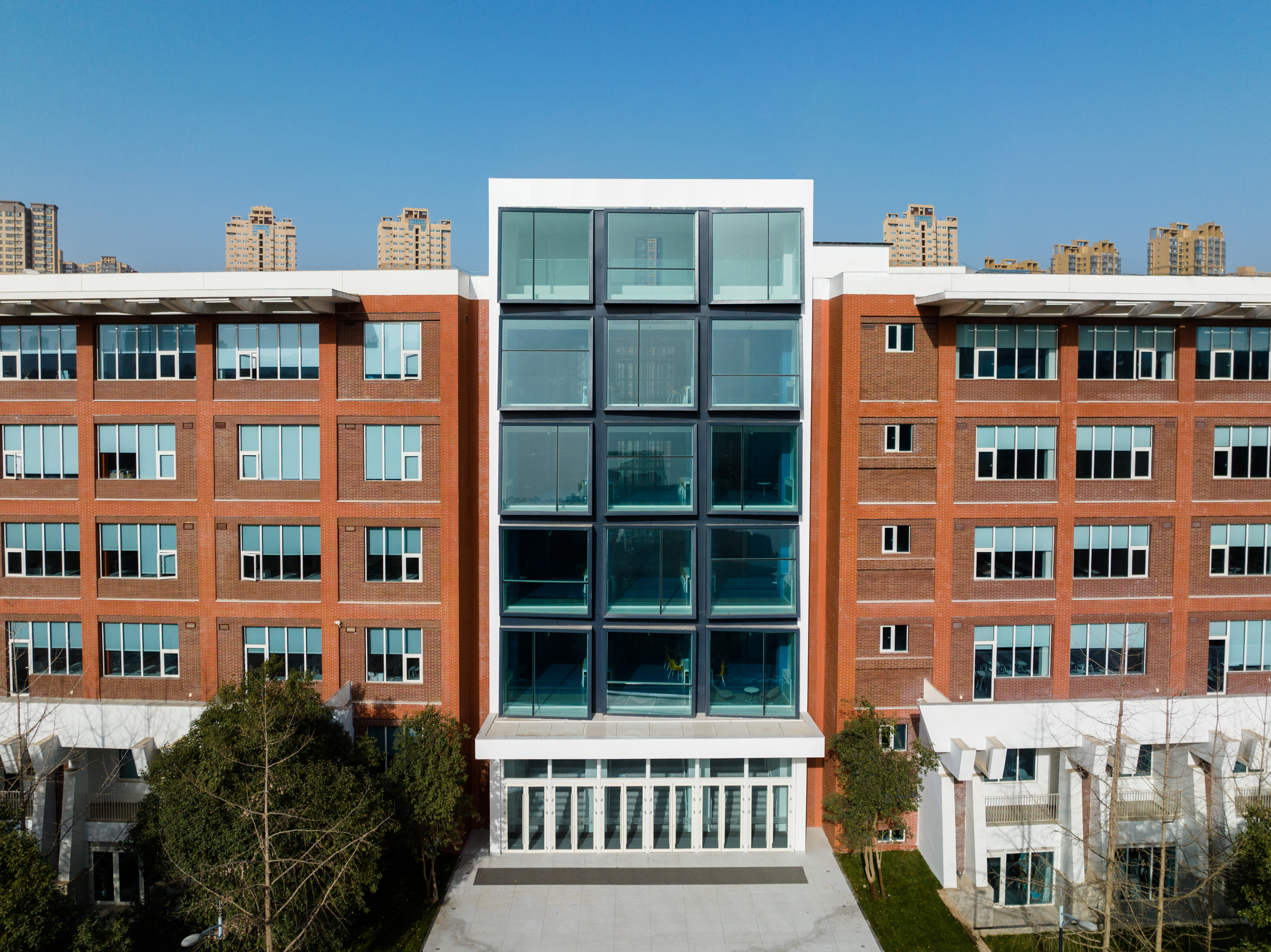 12月,北区教学楼D座和E座连接体改造完成。清新明亮现代的基调,为学生们提供一个满足休闲和学习的功能型空间。连接体南北建筑立面采用了不同角度排布的玻璃窗,特殊的艺术处理方式,让建筑不论从校园哪个角度看去,都有着新鲜的视觉感。大面积玻璃的使用,使整个连接体通透、轻巧,为室内提供了充足的光线及绝妙的窗景。