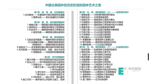我们从“恢宏大气”,“移天缩地在君怀”的皇家园林,讲到“诗情画意”、“精致风雅”的江南园林,探寻传统园林的造园情怀与园林意境;从先秦上林苑的象天法地,讲到“竹林七贤”魏晋风骨的审美自觉,再到“万园之园”圆明园的中西融合,探寻传统园林的时代特征与历史演变。