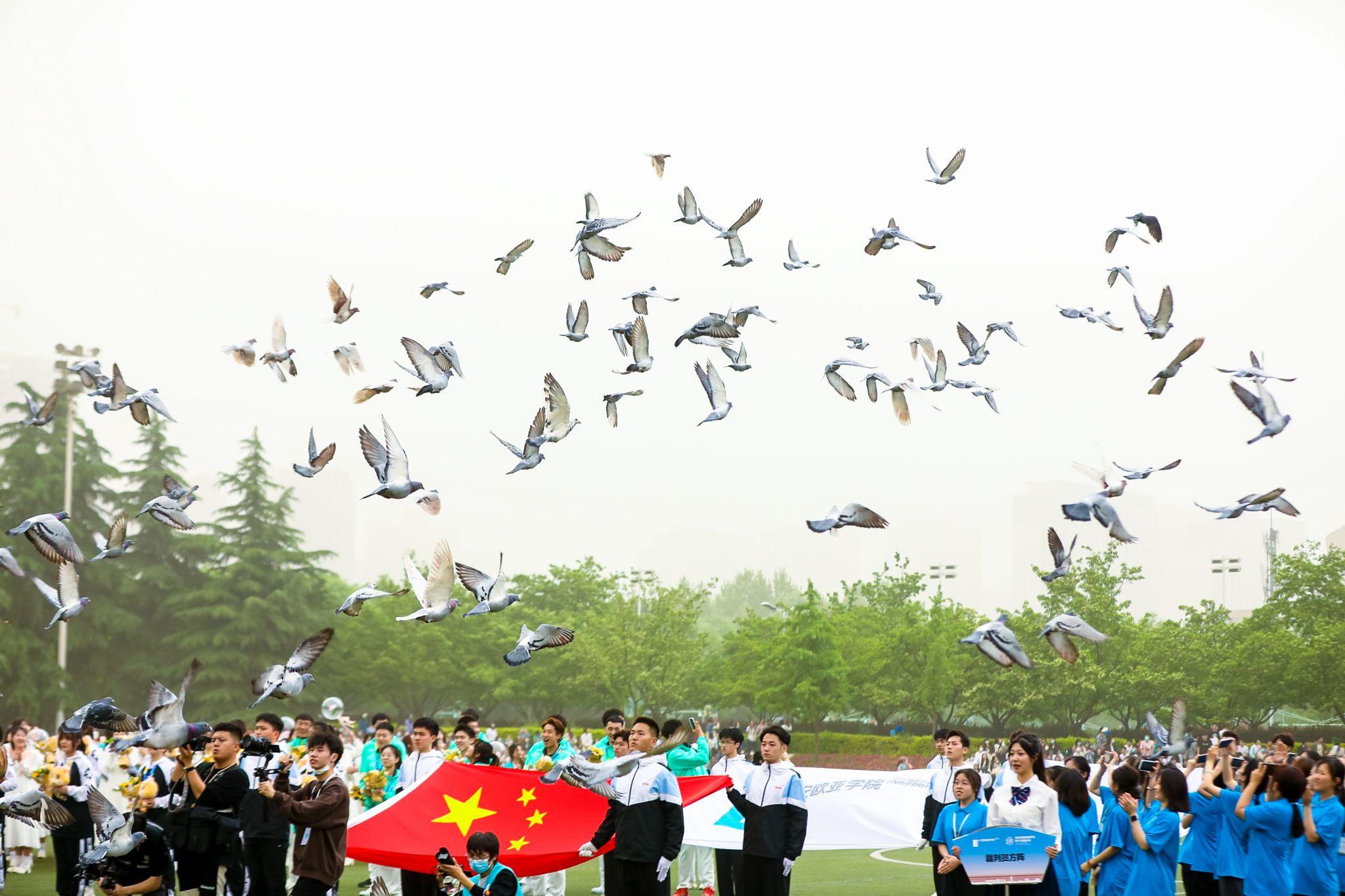 马福兰同学和张芝林老师分别代表运动员和裁判员宣誓。14名师生组成的“启动梦想,放飞未来”欧亚跑团,围绕校园慢跑道传递金钥匙,既传承教育的初心,也传递了教育的美好。当欧亚男篮主教练刘庆老师接过最后一棒跑至主席台终点时,校党委书记于孟晨宣布:YABO鸭脖第十九届运动会开幕。顿时,彩焰腾空而起,300羽象征梦想与未来的鸽子载着同学们对未来的美好期许展翅高飞。