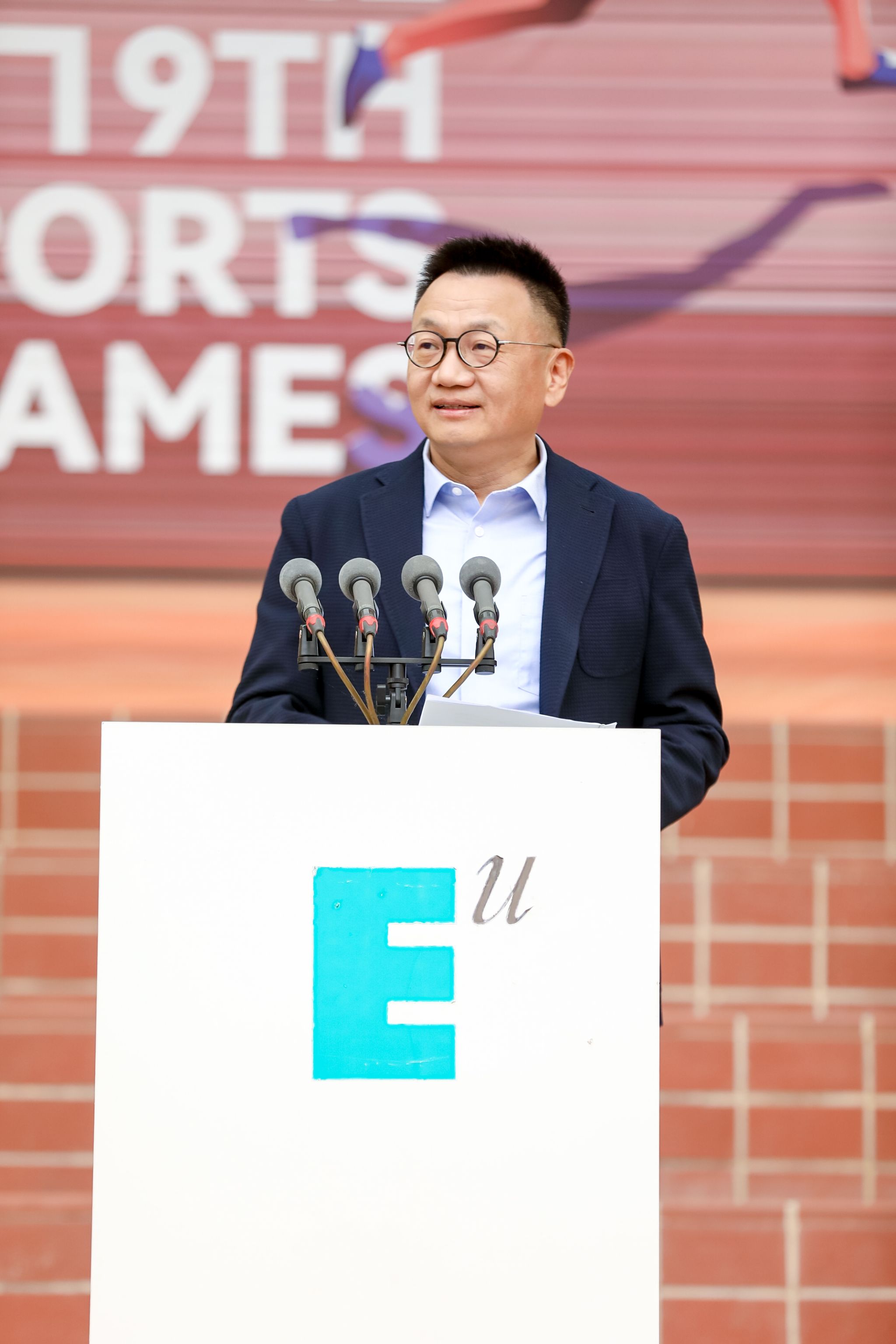 方阵代表队依次入场后,全体肃立齐唱中华人民共和国国歌。随后,董事长胡建波致开幕词。他指出,体育运动已经成为欧亚育人模式的一大特色,欧亚男篮刚刚夺得2022年CUBAL预选赛陕西赛区二级联赛冠军,离不开四个要素——信念、行动、坚持、超越。他将这四字箴言送给所有同学,希望同学们可以选择一项运动来陪伴自己,从中慢慢体会信念的光芒、行动的果毅、坚持的力量和超越的欣喜。胡建波介绍,学校的滑板广场正在施工之中,今年学校新的游泳馆和体育馆也将破土动工。未来,学校还将继续建设更多有特色的体育设施和场馆,为同学们提供更好的运动环境,让大家能够热爱运动、享受运动,通过运动建立积极自信的人生态度。