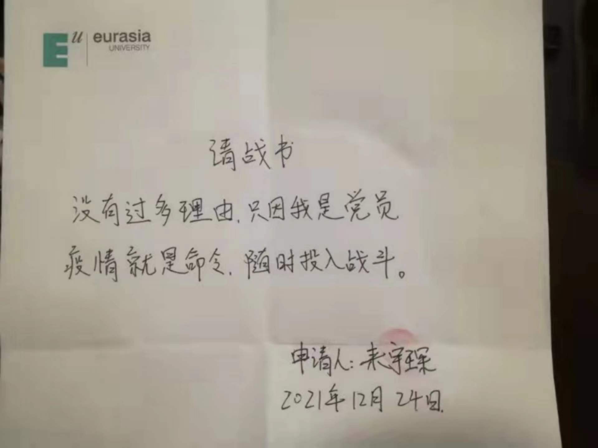 年关越来越近,一切都美好祥和,不料一场突如其来的疫情再次席卷古城西安,一切都是那么的突然。正在上班的我也是每天关注着本轮疫情的实时动态,终于在12月22日的临下班前,看到了全市进行封控措施,我才意识到,这次的疫情可能远比我想象的严重,公司也是紧急为我开具了工作证明。原本属于西安国际港务区中欧班列(西安)集结中心特殊行业工作的我,要坚守在工作岗位,确保中欧班列正常运营,但没过多久,就接到紧急通知,我家所在地要进行全面封控,所有人居家不外出,所以我遵守公司和园区的相关防疫制度,居家办公。这期间虽然不能坚守工作岗位,但我也想做一些自己力所能及的事情为这次疫情阻击战出一份自己的力。看到群里在招募疫情防控小分队,我没有犹豫,党员的身份告诉我,我不但不能退缩还要毫不犹豫往前冲,所以我果断报了名。之前几次西安出现疫情,因为我没在西安,想出力却事实不允许,这次我就在西安,我就更不能坐以待毙,于是我向党组织递交了我的请战书,用自己的微薄之力去帮助我的城市尽快把“病”治好。要问我为什么参加防疫工作,原因很简单,正如我的请战书写的一样,“没有过多理由,只因我是党员”。不久我便得到了我的任务凌晨4点至清晨8点,在防疫检查站执勤,同时我也加入了第五轮核酸检测服务队里,做了一些简单的事情。看着周围与自己并肩作战的战友们,也看着淳朴的村民们,我感觉我做的这件事情,无上光荣。