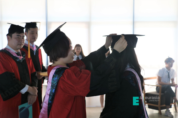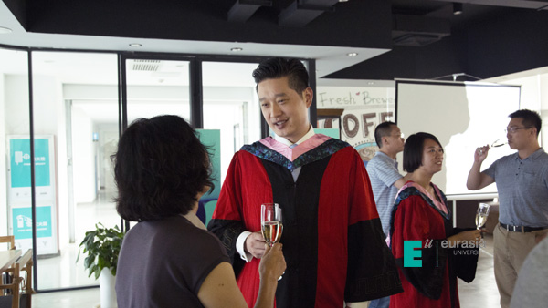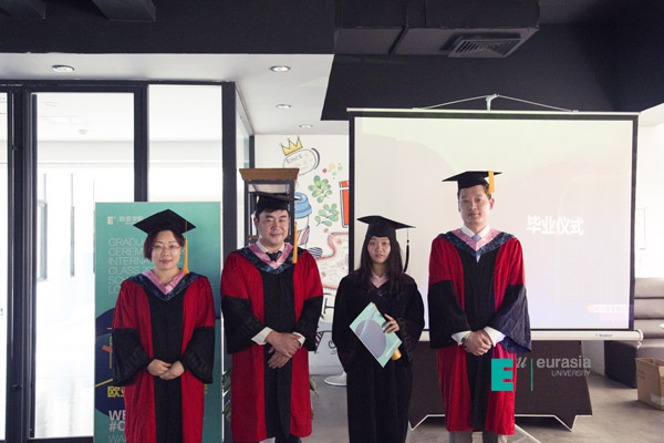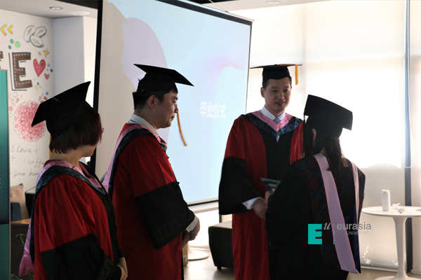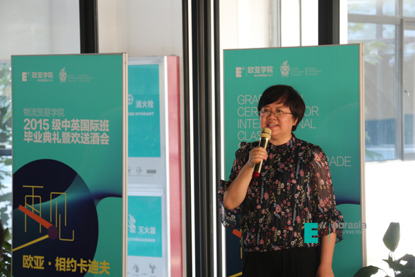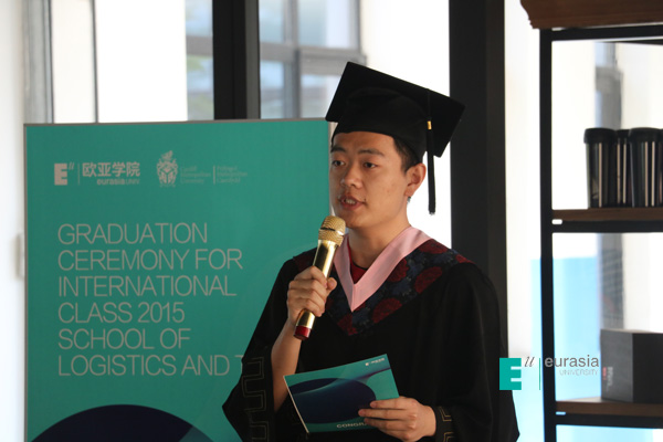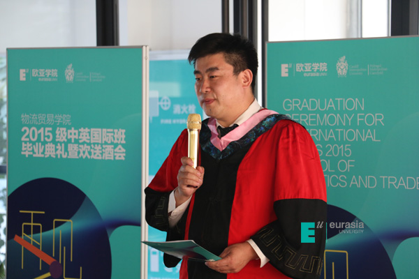 毕业典礼中,英国卡迪夫城市大学中国办公室首席代表李斌老师代表英方向各位领导,学生及家长致毕业辞。英国大学与学院共计 180 多所,在过往的 153 年发展历史长河里,作为英国传统与现代相互集合的大学,李斌老师相信在中英高等教育发展与交流中的价值与其体现,已经在过往的五年中,在欧亚学院物流贸易学院中英国际班中淋漓尽致的体现出来。今天,中英两校为中英两国高等教育及优秀人才培养设计了适合中国高等院校发展、适合中国学生快速成长的渠道。李斌老师表示卡迪夫校方愿意以永不懈怠的精神状态和一往无前的奋斗姿态,继续朝着实现双方高等教育国际化2.0版本的宏伟目标奋勇前进。