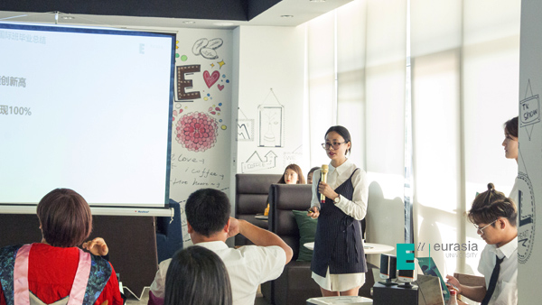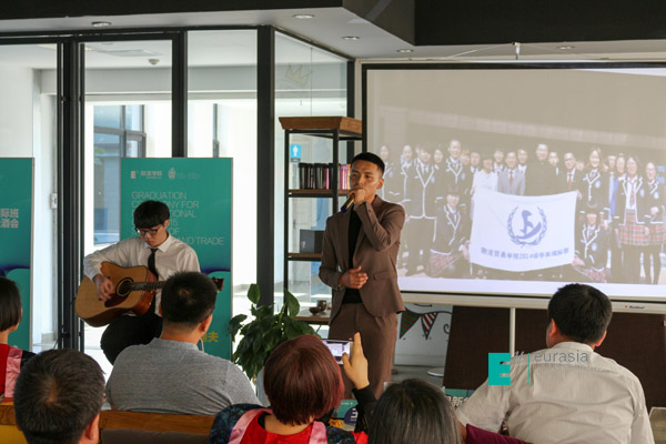 不忘初心,方得始终,在这离别之际,2015级中英国际班专升硕项目学生景晓蕾及本硕套读项目学生卢沛豪代表本届毕业生发言。两位同学都表示了自己在欧亚的成长,三年欧亚的学习生活充实而美好,这些努力的日子也为去卡迪夫的学习打下了坚实基础。国际班在教育教学中,组织了丰富的节日体验活动,户外踏青还有极限素拓,每学期的卡迪夫教学周也让学生们提前感受英国上课氛围,外教课堂体验也为学生们奠定了国外授课基础。同学们在最后表达了对欧亚学院的感谢,欧亚物流贸易学院为学生们创造了这样一个走向国际化的平台;同时还表达了对校领导的感谢,感谢校领导对国际项目的支持;最后学生对老师和父母的默默付出表示感恩。“爱上欧亚,爱上未来的你,未来的我一定比现在我们更好”。今后他们会在卡迪夫城市大学会更加努力的塑造自己,未来希望以全新的面貌在欧亚相聚。